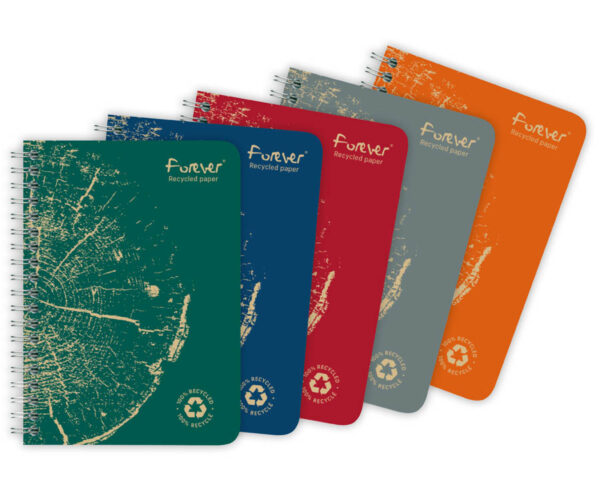 100% recyklovaný prémiový papír 90 g/m² s dokonale hladkým saténovým povrchem, 100% recyklované kartonové desky, mikroperforace pro snadné odtržení listů, dvojitá drátová vazba, barevný assort, certifikát FSC