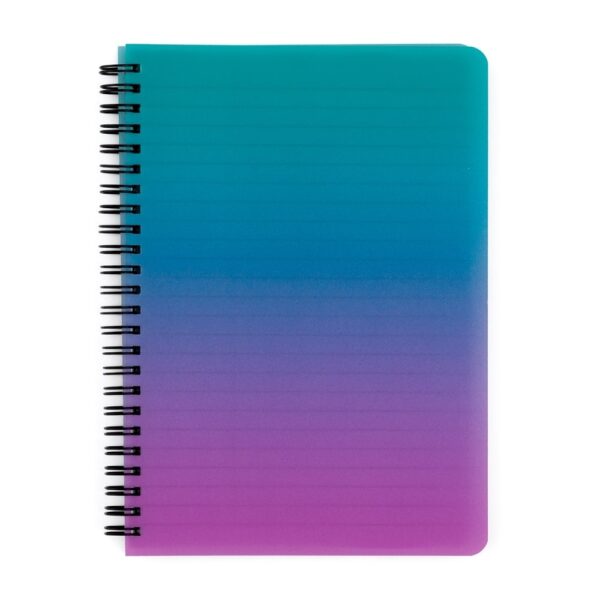 kroužkový blok s dvojitou spirálou ve formátu A5, boční vazba umožňuje snadné otáčení listů, desky z pevného polypropylenu, uvnitř linkované listy s perforací, papír 70 g/m2, 60 listů