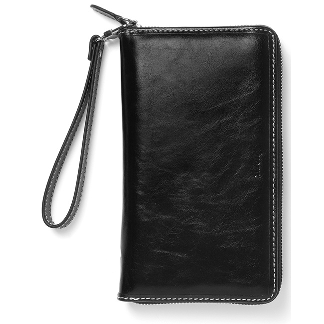 odnímatelný řemínek na ruku a vyjímatelnou kroužkovou vazbu, což umožňuje použití i samostatně jako peněženku.