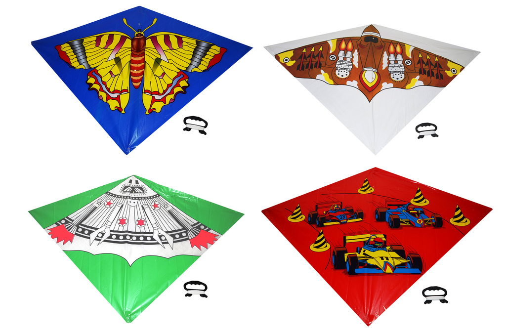 Létající drak. Rozměry 110 x 72 cm. 4 varianty – raketa, letadlo, motýl, formule.