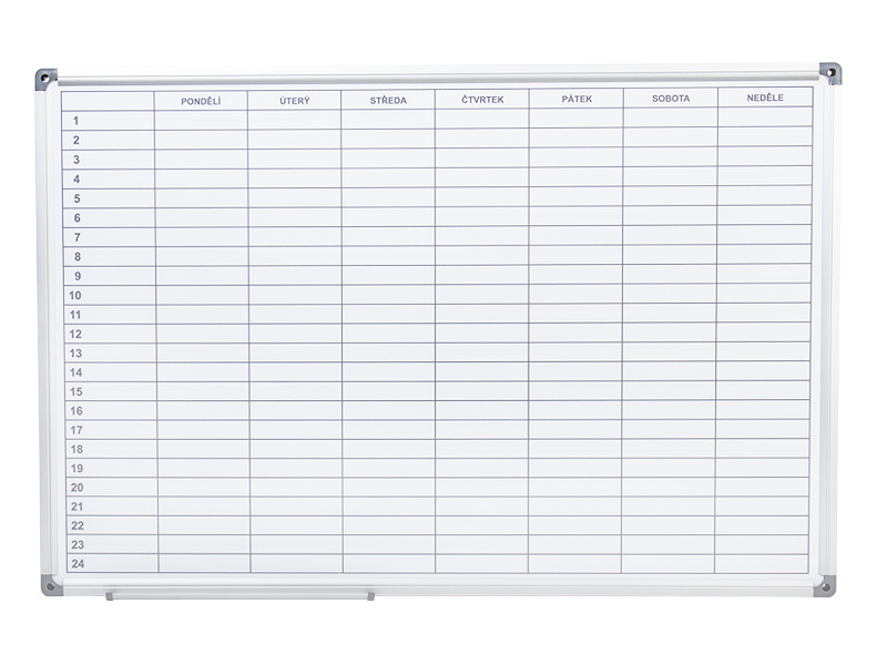 týdenní plánovací tabule s kvalitním nátiskem rastru pro týdenní plánování, sada pro připevnění, krytky rohů, odkládací lišta 30cm, popisovač a 3 magnety jsou součástí balení, jako příslušenství je možné dokoupit magnetické symboly