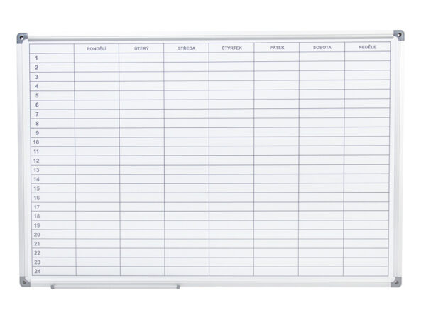 týdenní plánovací tabule s kvalitním nátiskem rastru pro týdenní plánování, sada pro připevnění, krytky rohů, odkládací lišta 30cm, popisovač a 3 magnety jsou součástí balení, jako příslušenství je možné dokoupit magnetické symboly