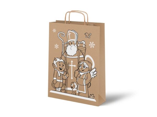 Dárková papírová taška s průhmatem a potiskem Mikuláše, anděla a čerta. Ideální na vytváření čokoládových balíčků pro děti!